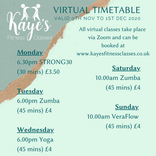 ALL CLASSES ARE BOOKED AT www.kayesfitnessclasses.co.uk AND ARE PAYG. CLASS PASSES ARE AVAILABLE TO PURCHASE FOR DISCOUNTED PRICES, THESE ARE NON-REFUNDABLE. Any passes bought 1st Nov onwards and not used by 15th Dec will be extended by 3 weeks so you get chance to use them in January.